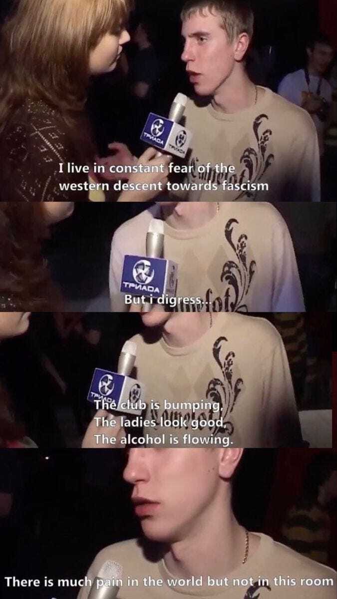 as in, what movies are getting a lot of attention, what shows are being promoted at a scale that seems a bit much, what types of personalities are cropping up and what aesthetics seem to get pushed to the forefront more than others, the average person can triangulate what the culture is trying to be, or has succeeded in becoming. Girl bosses became mom friends became office sirens, curvy girls became clean girls, witty rapport became evisceration. The culture wants thin, wants hard, wants mean. It wants infighting, wants blood, wants survival of the cruelest. It wants uniform, it wants lethal application of deru kugi wa utareru,1 it wants dutiful little guard-prisoners in the panopticon.