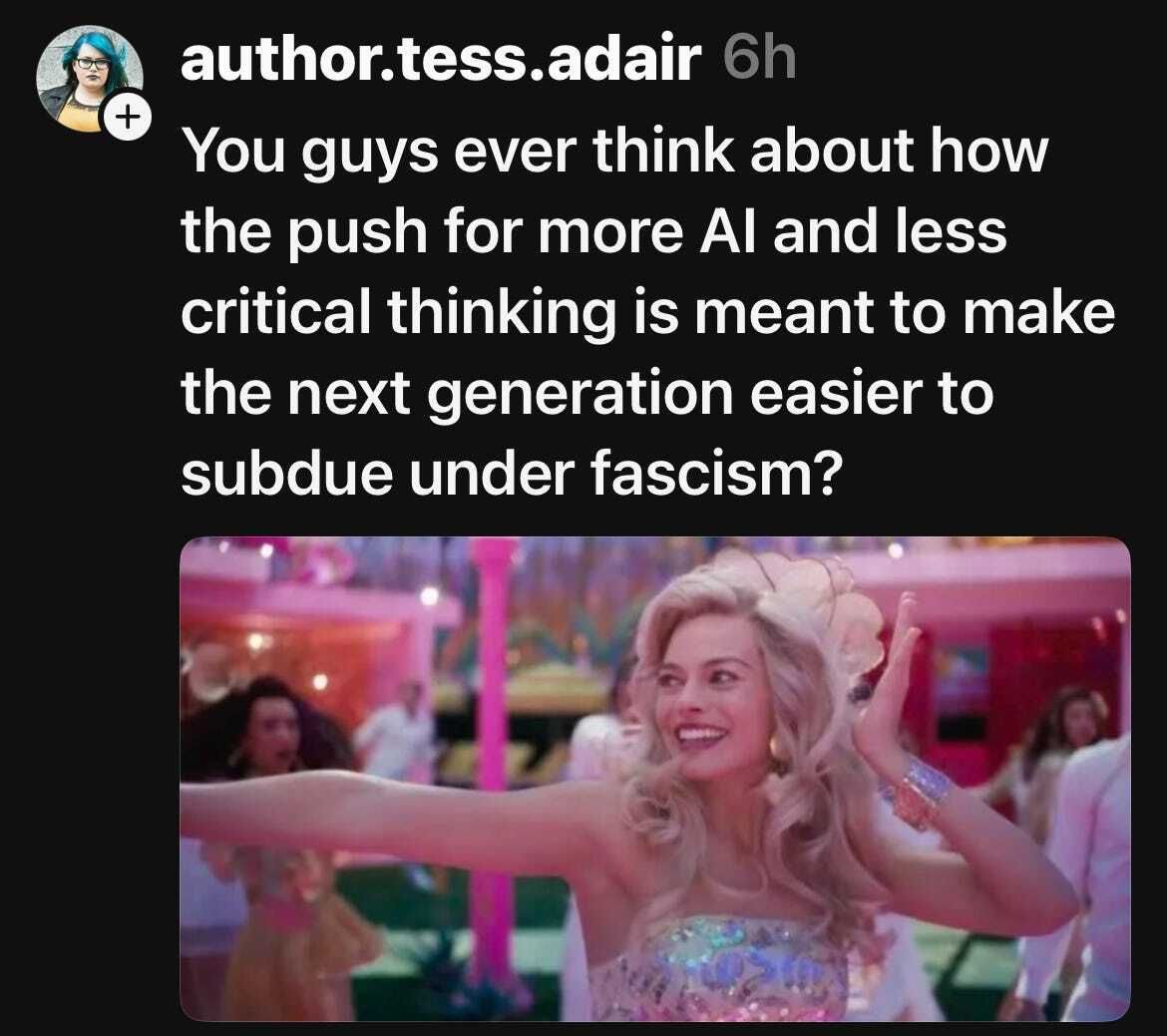But… it certainly didn’t help. Zero faith in the competency one party that markets itself as “less likely to intentionally kill you”6 combined with atrophied empathy and critical thinking (thanks a bunch, ChatGPT) isn’t exactly a smoking gun. But it’s certainly got a barrel, a trigger, and there’s a metallic tang of burnt potassium nitrate and sulfur haunting the air.
